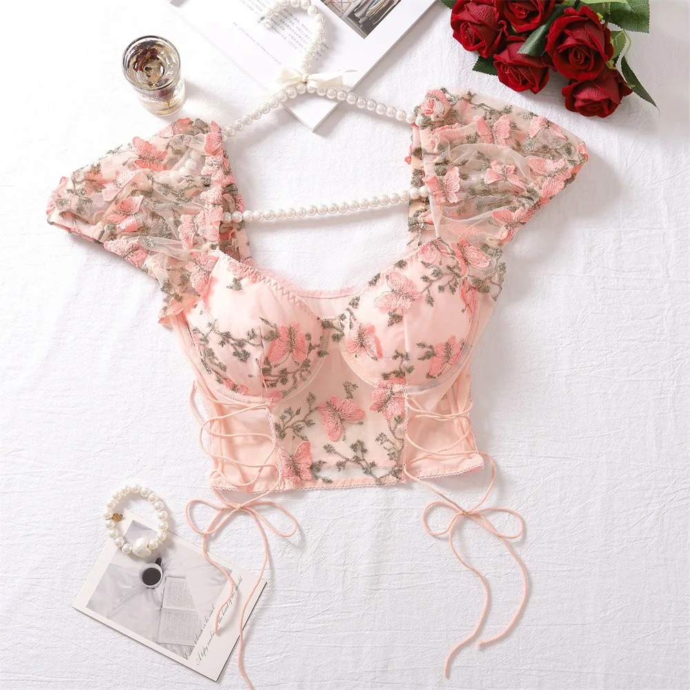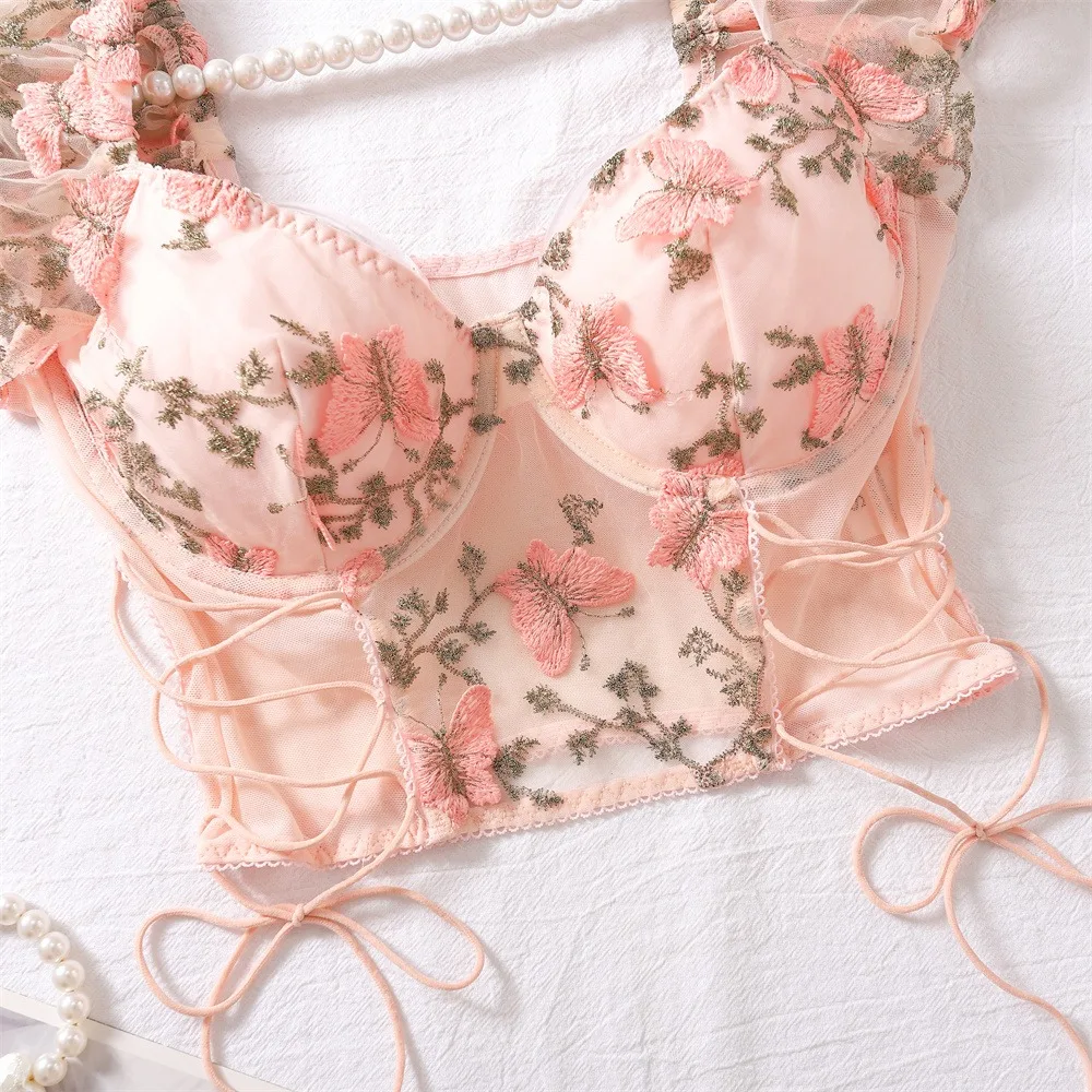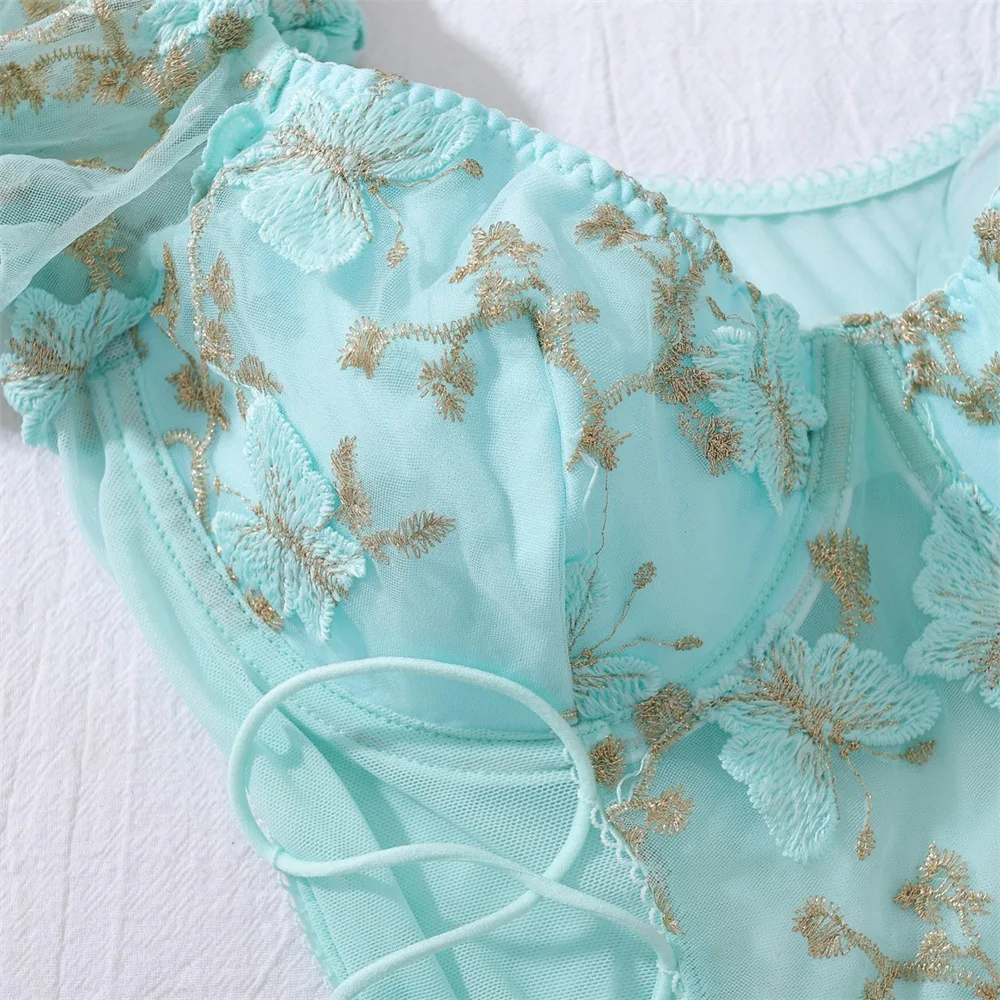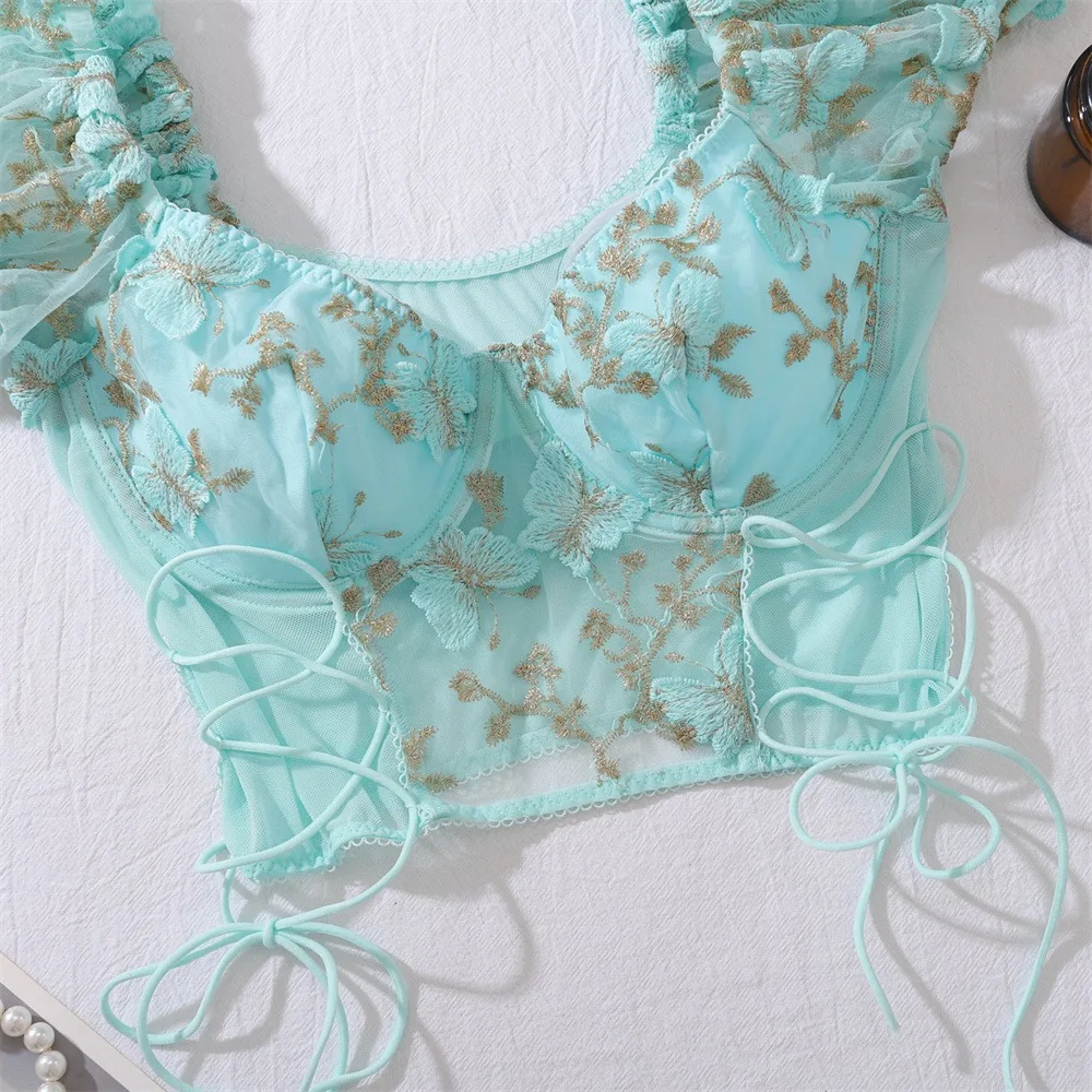 2 Pcs Sexy Lace Flower Embroidery Underwear Set Women's Bra Mesh Bubble Sleeve Tether Top with Steel Ring Bras and Thongs Sets