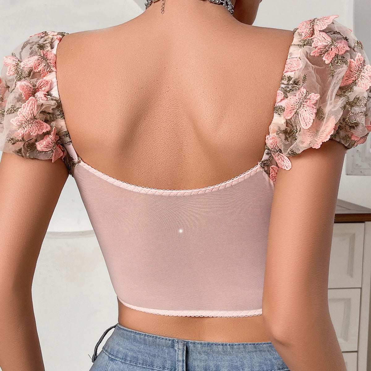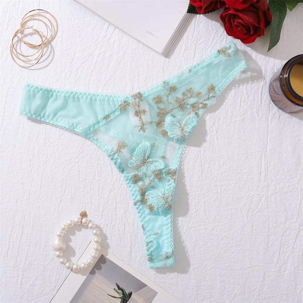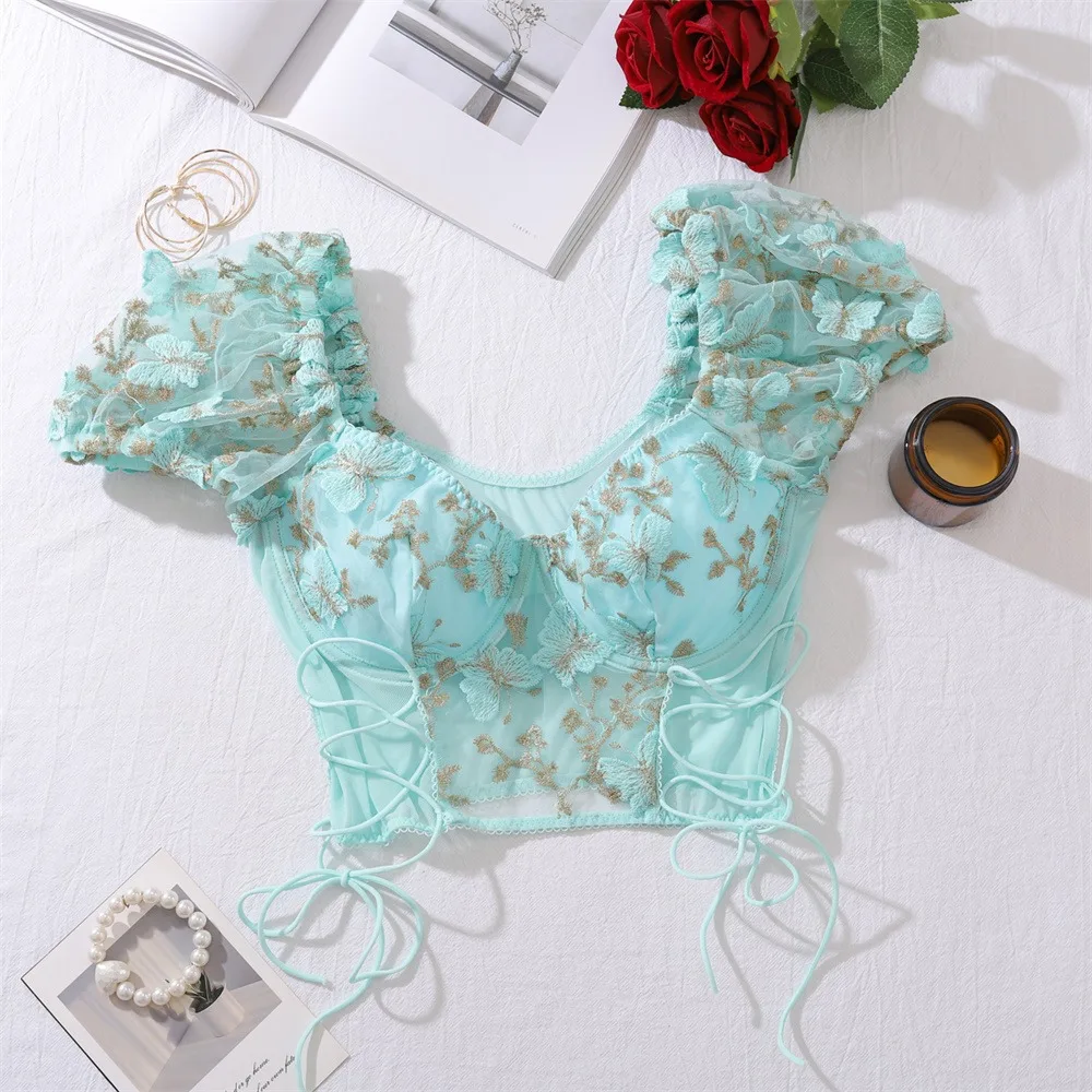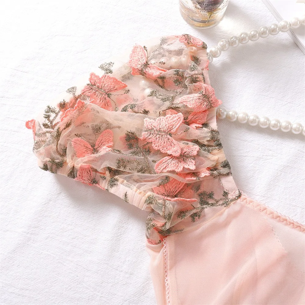 2 Pcs Sexy Lace Flower Embroidery Underwear Set Women's Bra Mesh Bubble Sleeve Tether Top with Steel Ring Bras and Thongs Sets
