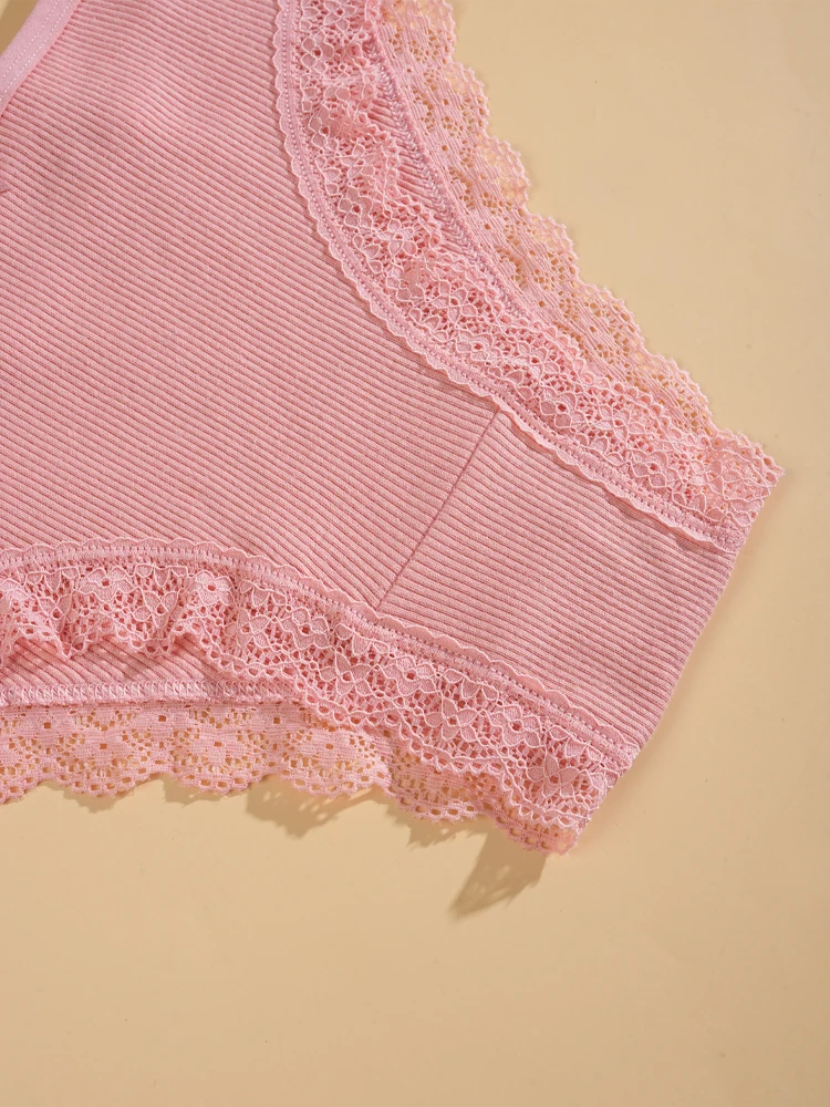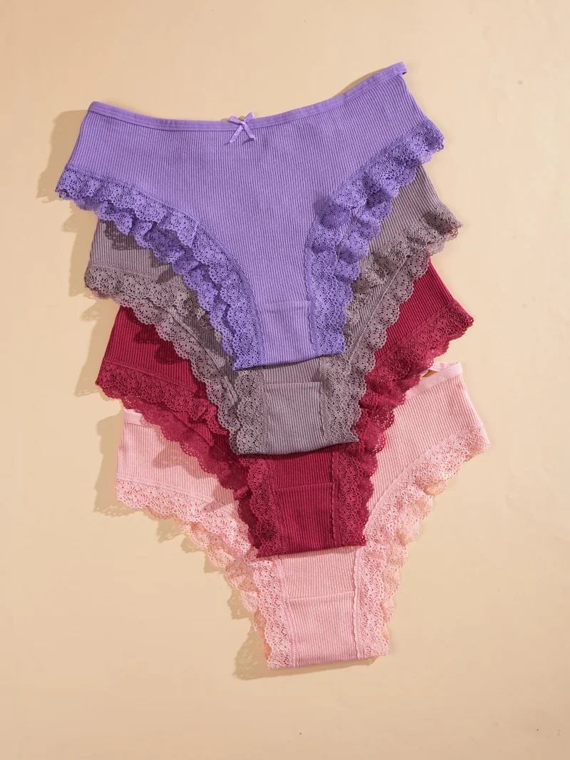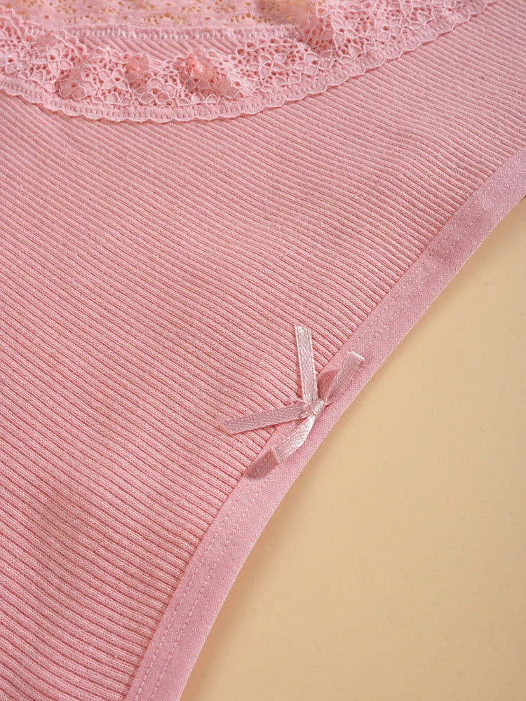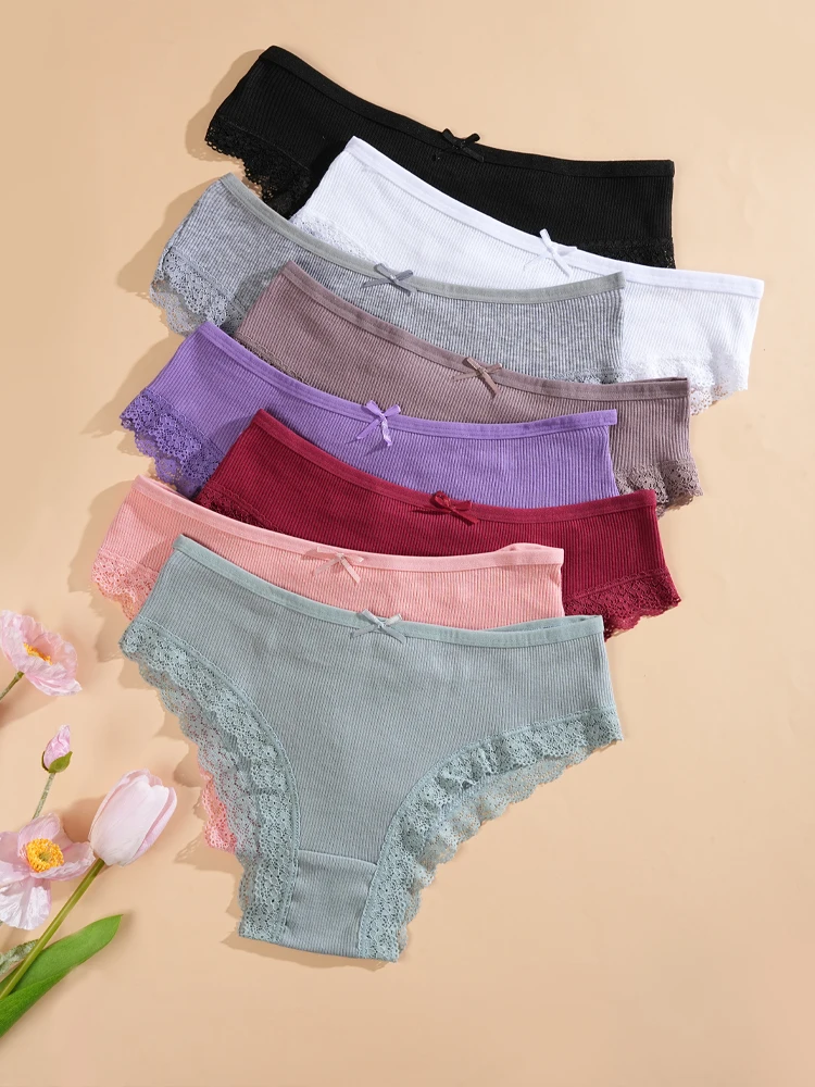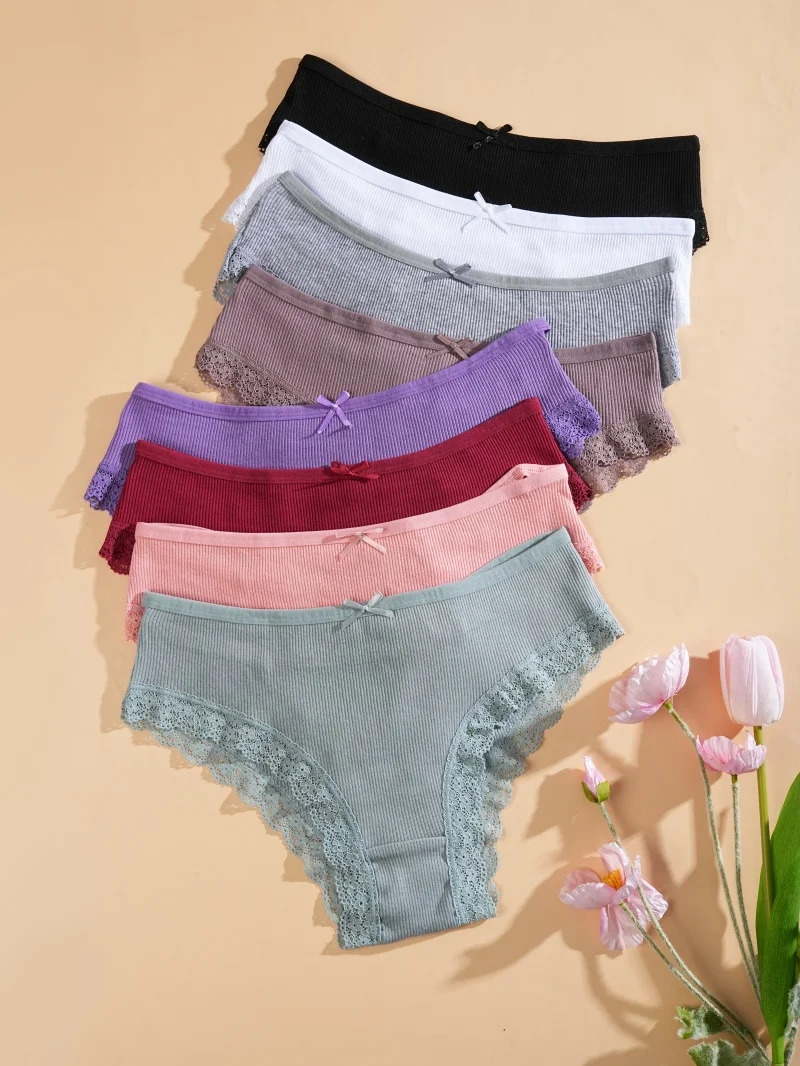8PCS Women's Cotton Fabric Panties Sexy Lace Bowknot Solid Color Bikini Underpants Fashion Double Straps Comfortable Underwear