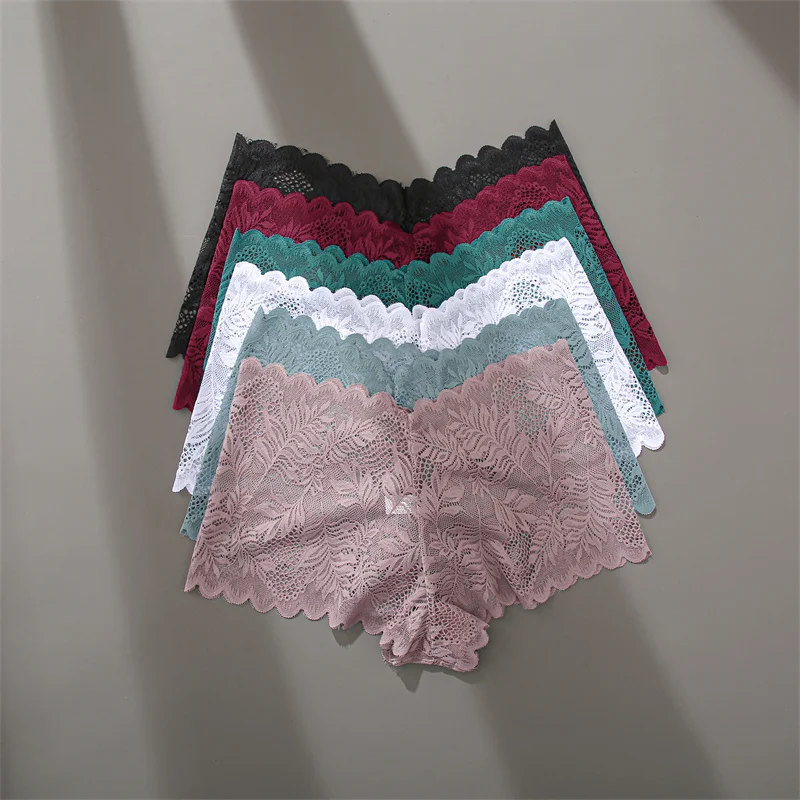 FINETOO 4pcs Lace Floral Boyshorts Underwear for Women Sexy Hollow Out Solid Panties Female Low-Waist Breathable Girls Lingerie
