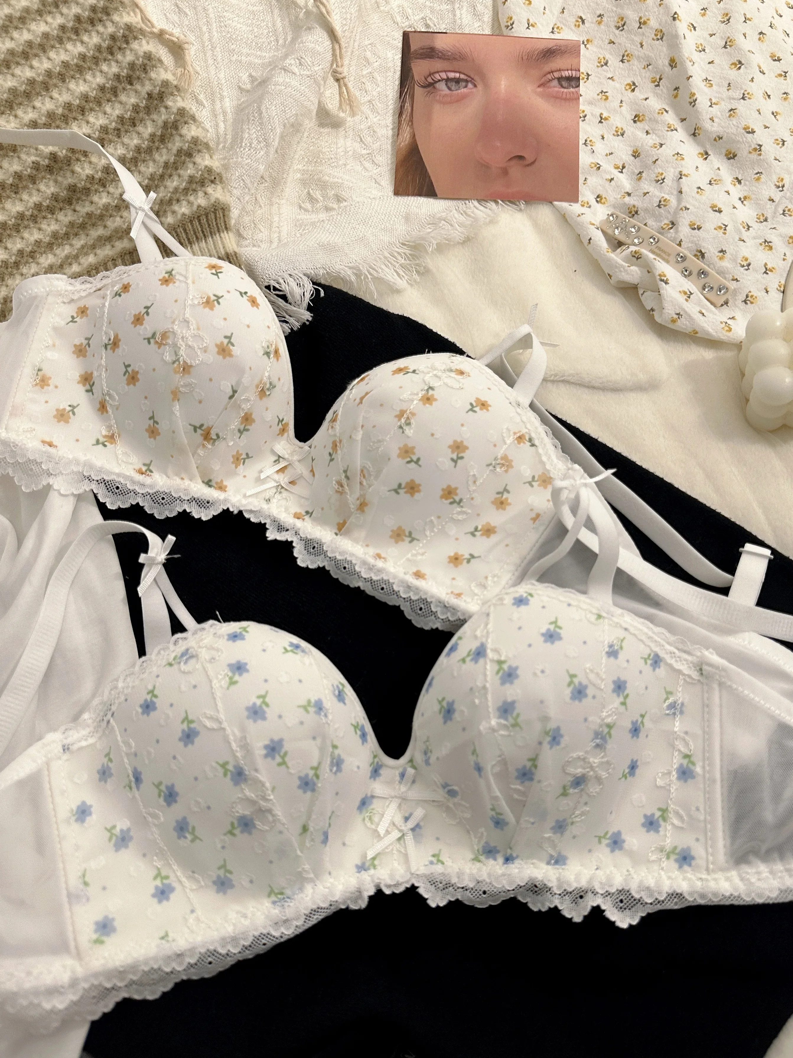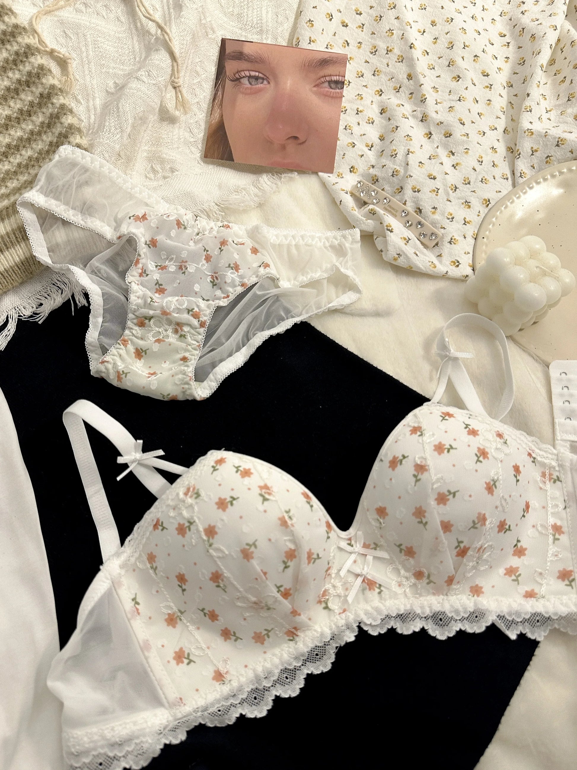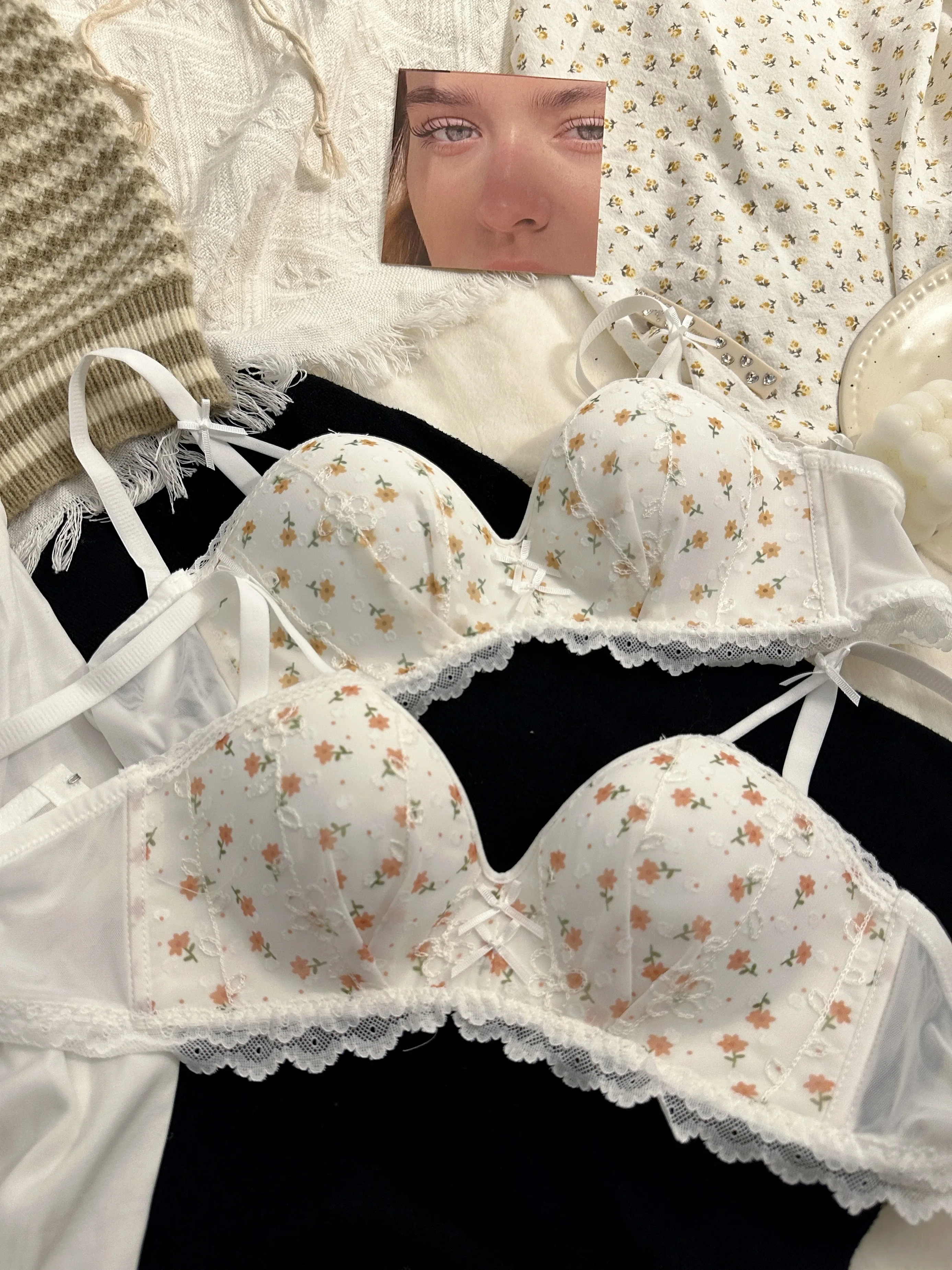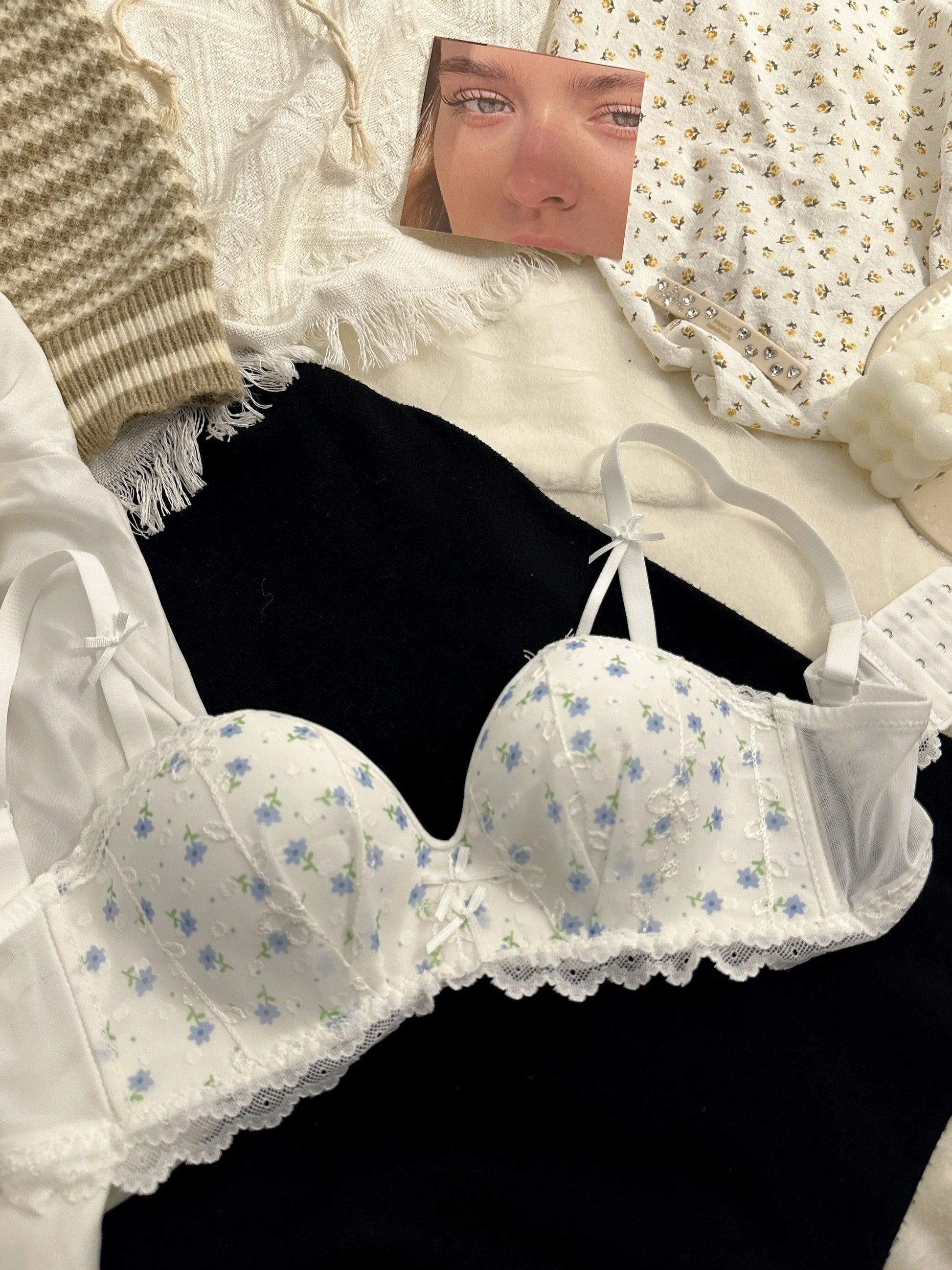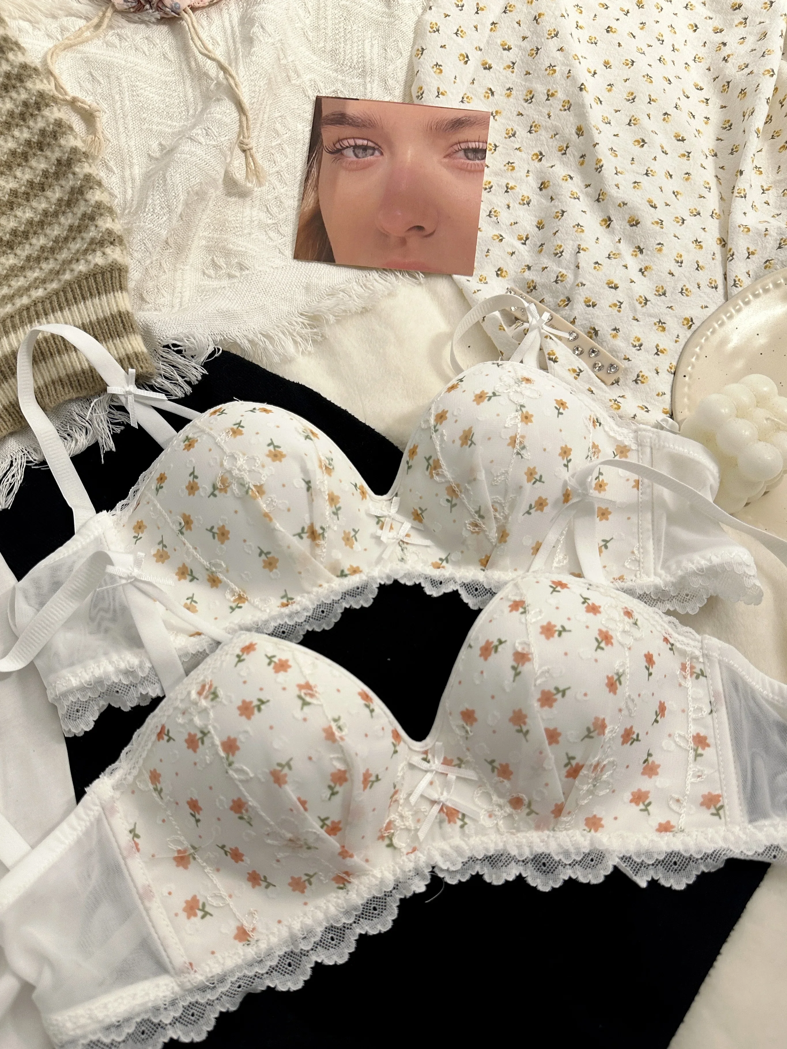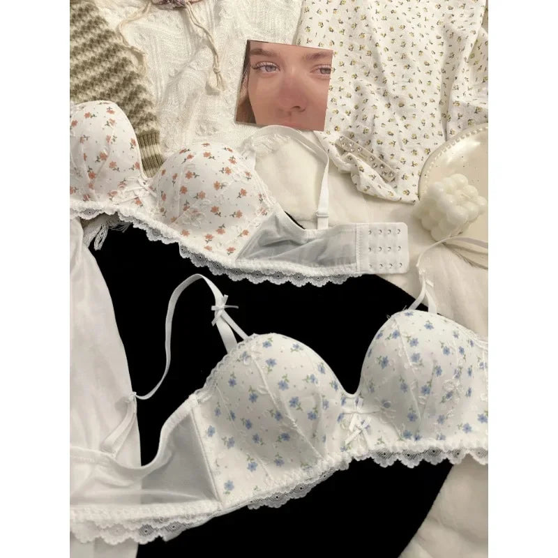 MOYISU JP & SK Lacy Lingerie Girl's Small Breast Pull Up No Underwire Top Support Anti-sag Retraction Sexy Floral Bra Cover Set