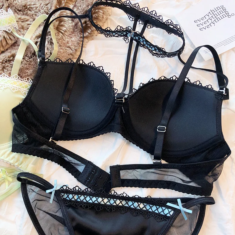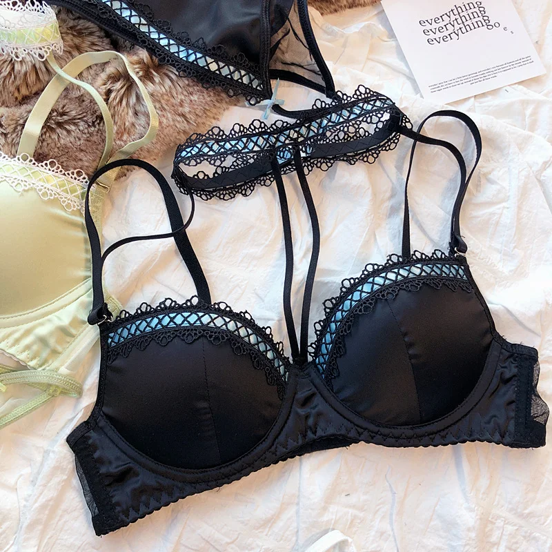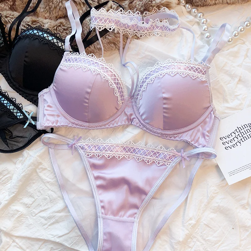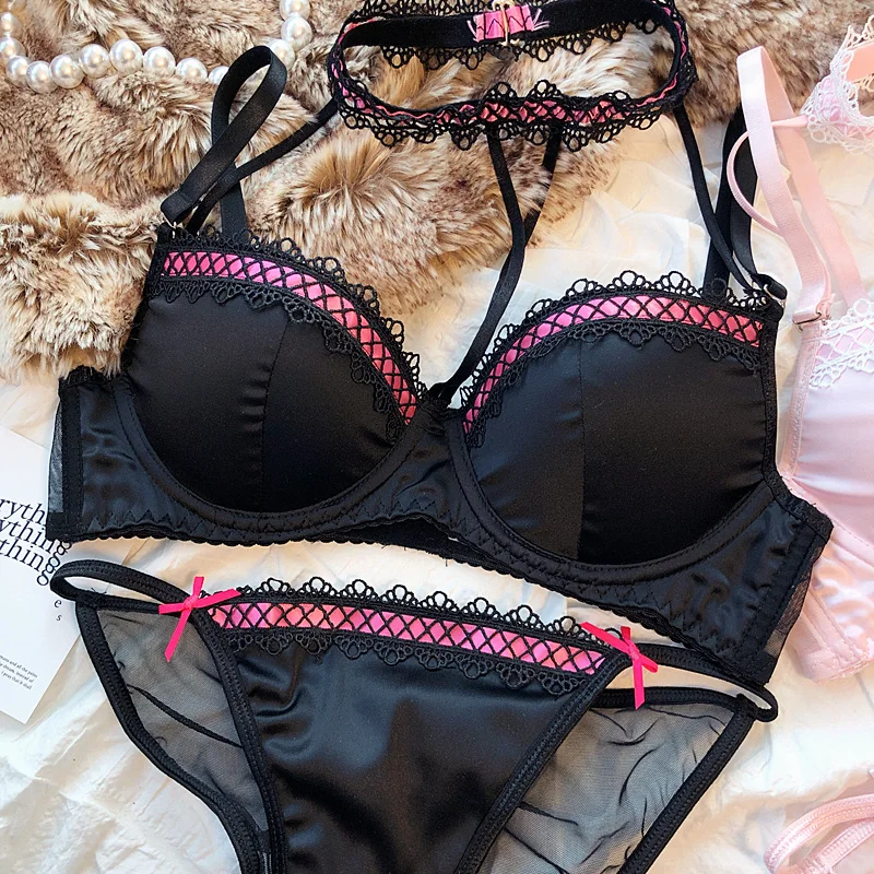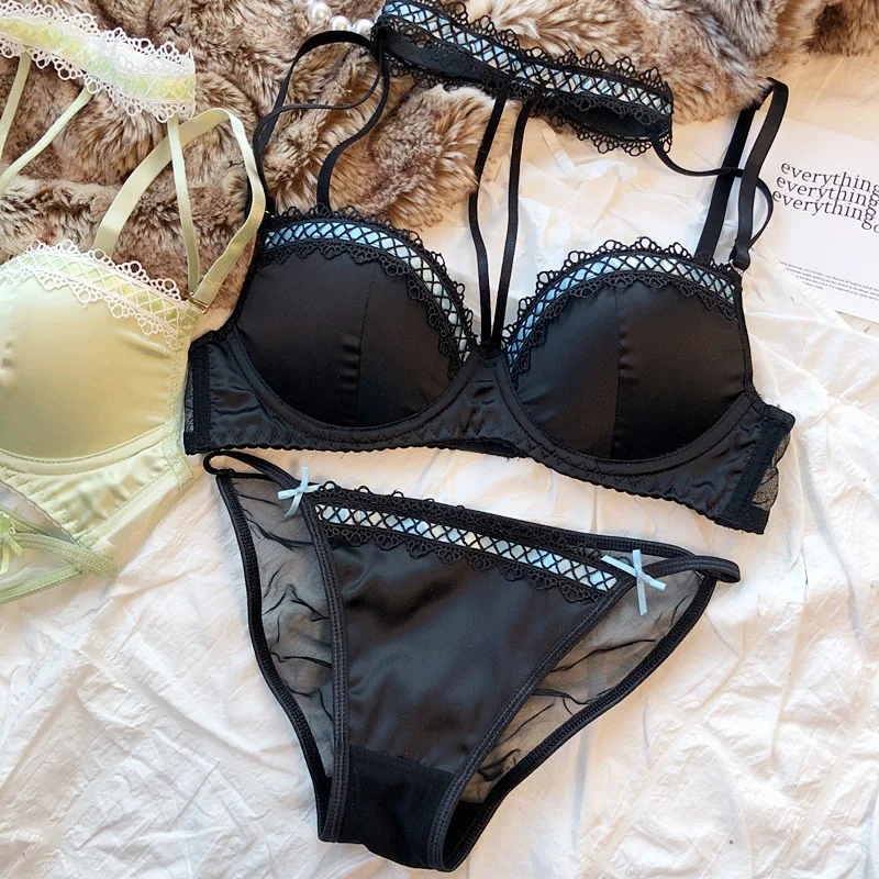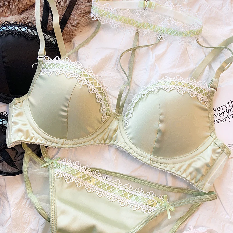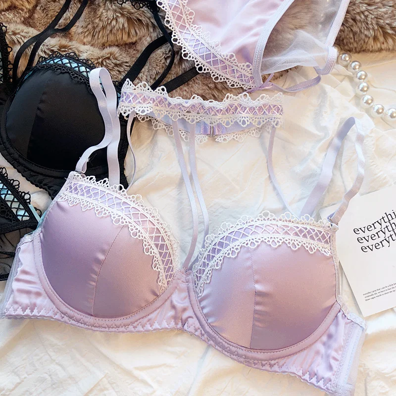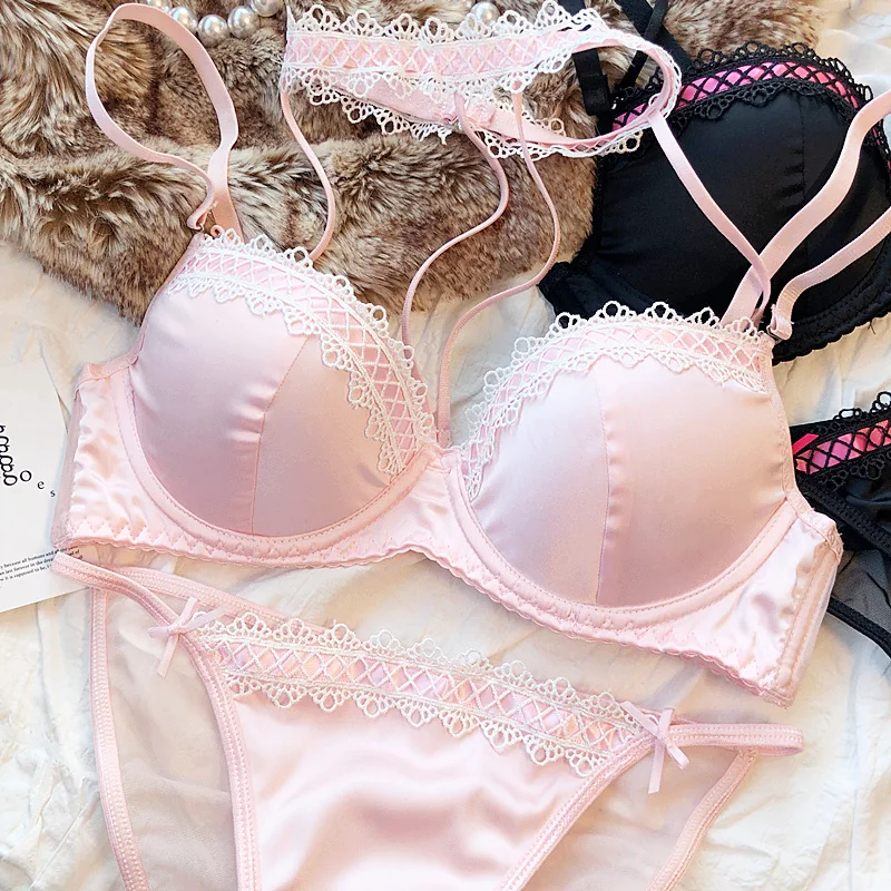 MOYISU Lolita French Pure Desire Sexy Lace Satin Spice Girl Bra Small Chest Gathering Halter Hollow Underwear Set Soft Underwire