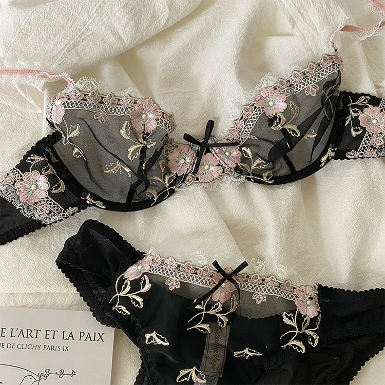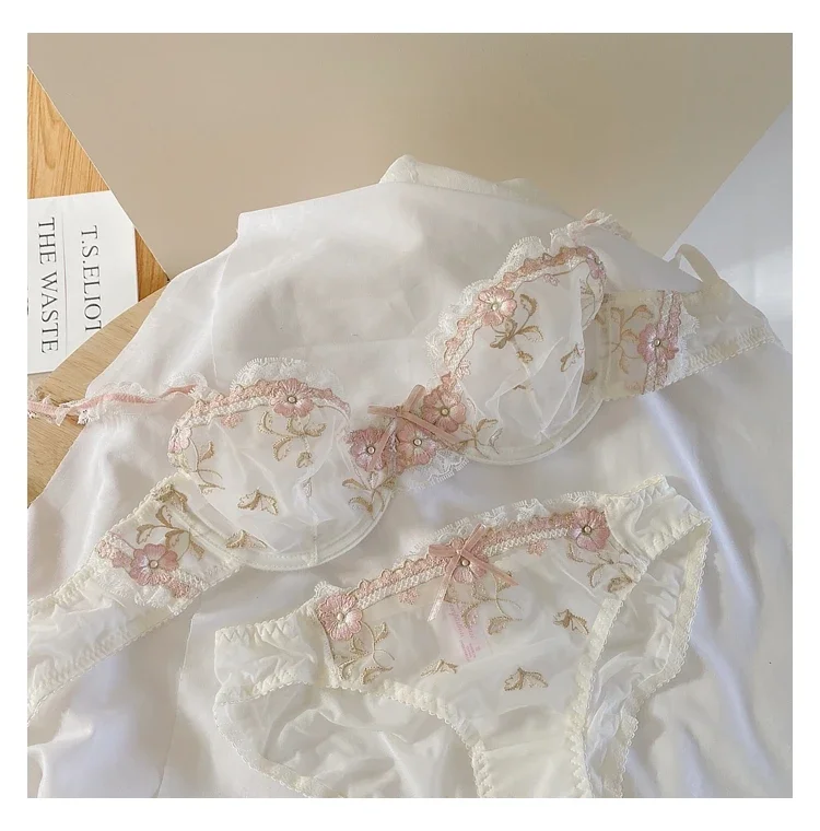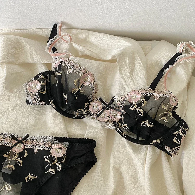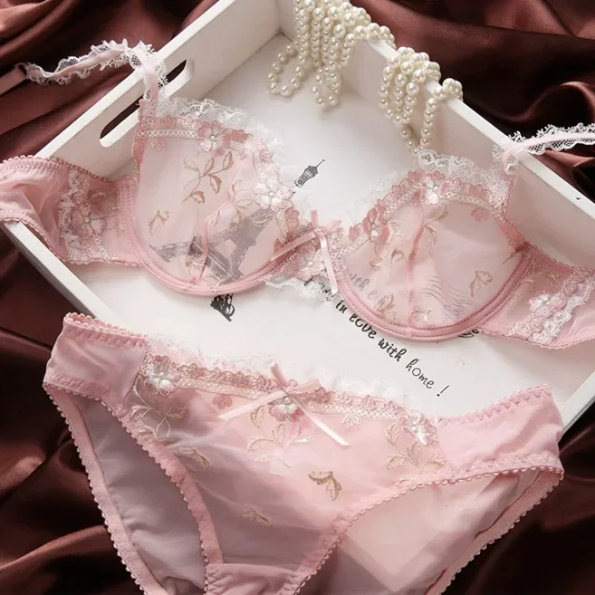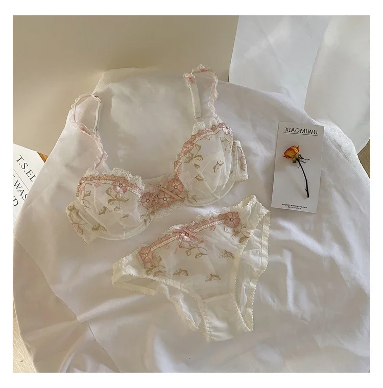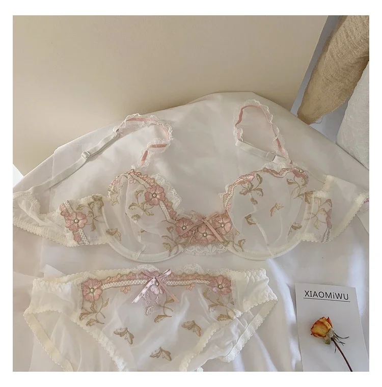 MOYISU New Arrival Luxury Pure Desire Lace Tulle Sexy Panties Lingerie Set Lilacs Embroidery Girl Boobs Big Size Big Boobs Small
