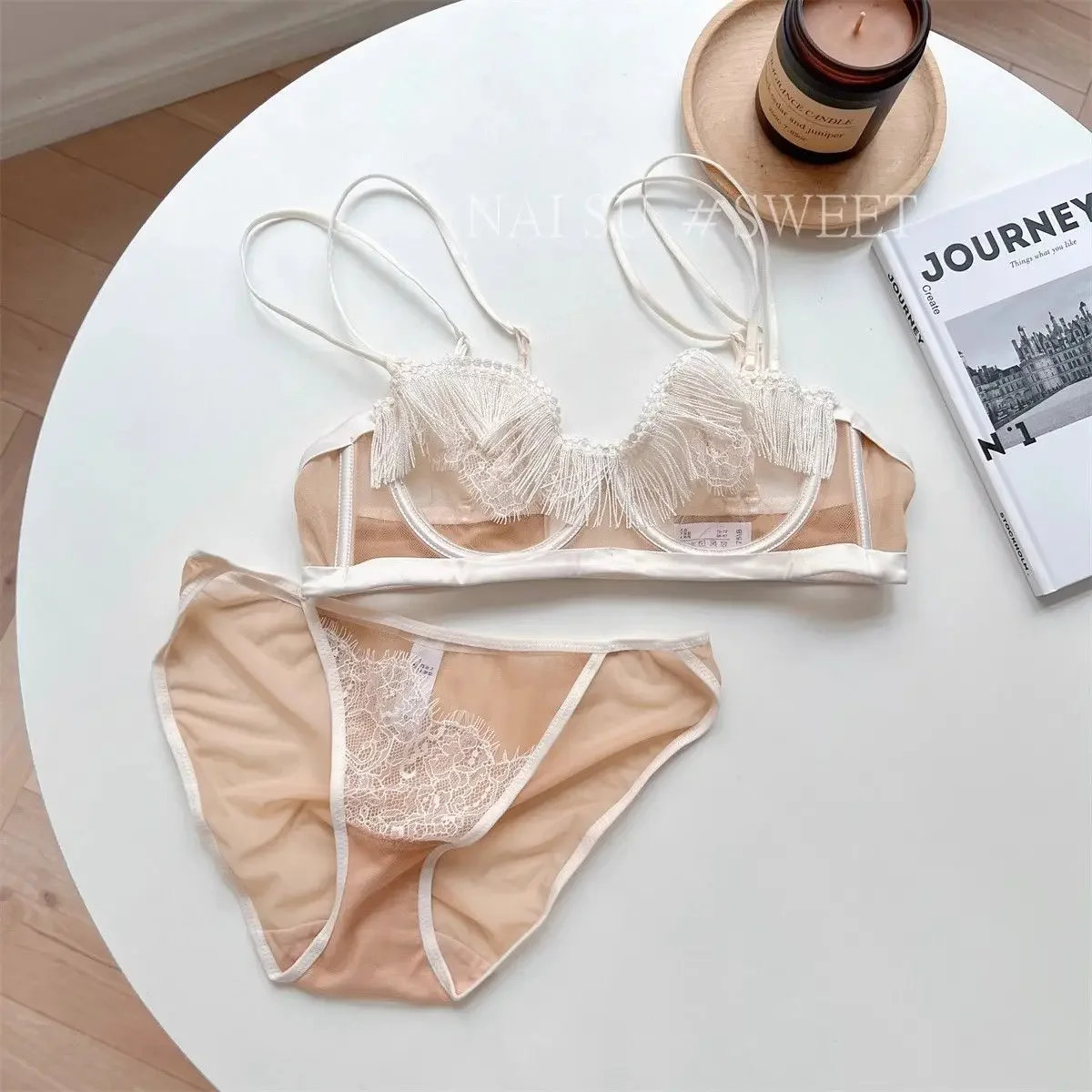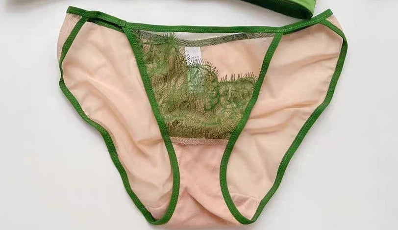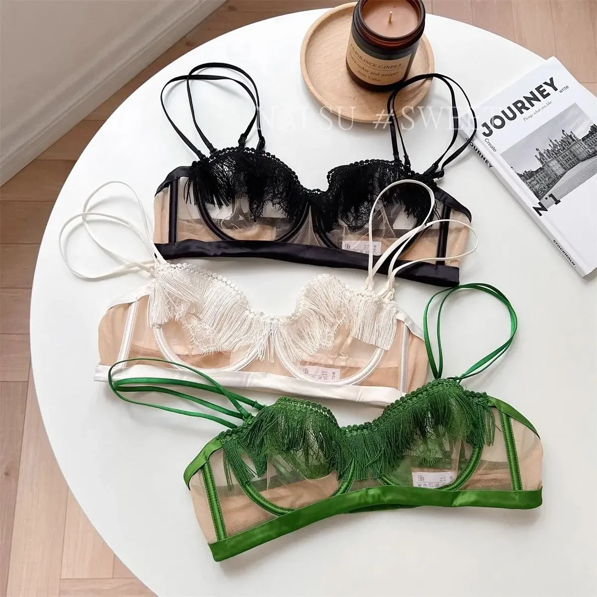 MOYISU Premium Sheer Mesh Bra Set Fringed Lace Half-Cup Minimizer, Ultra-Thin Luxury Lingerie Full Bust Coverage Slim Silhouette