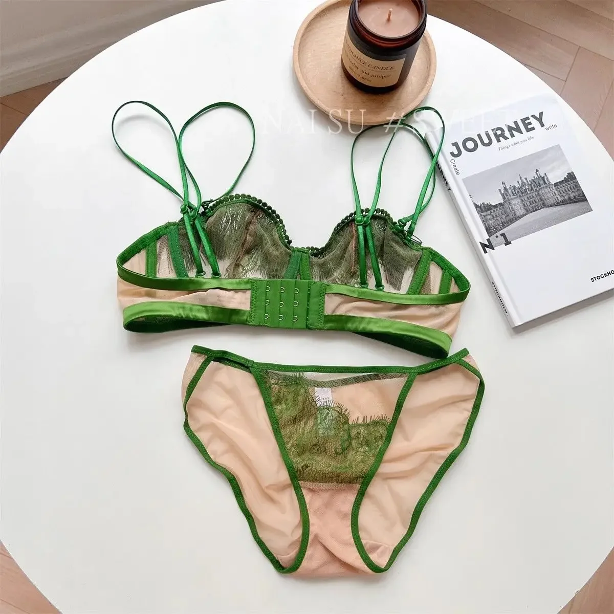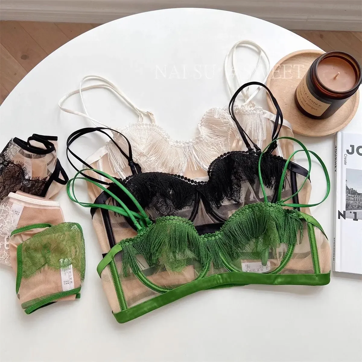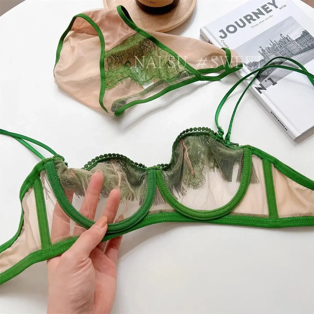 MOYISU Premium Sheer Mesh Bra Set Fringed Lace Half-Cup Minimizer, Ultra-Thin Luxury Lingerie Full Bust Coverage Slim Silhouette