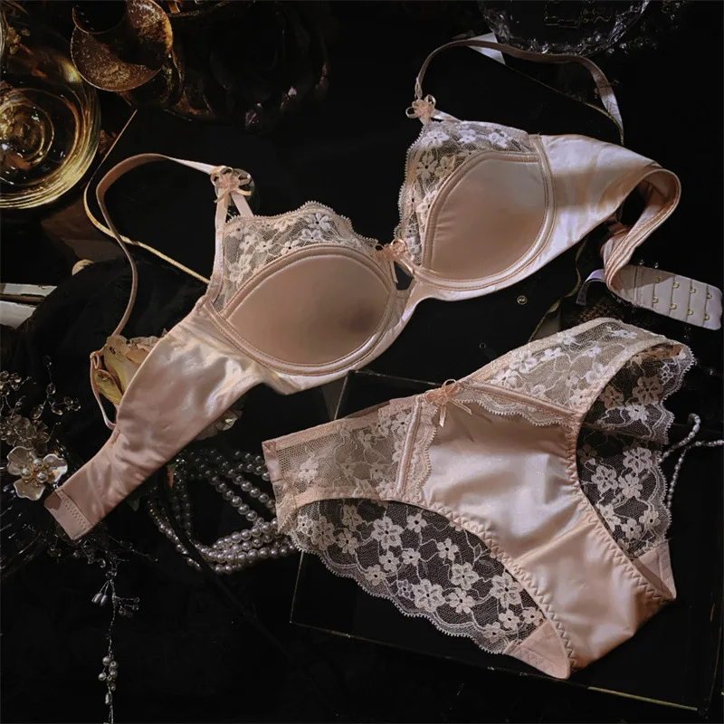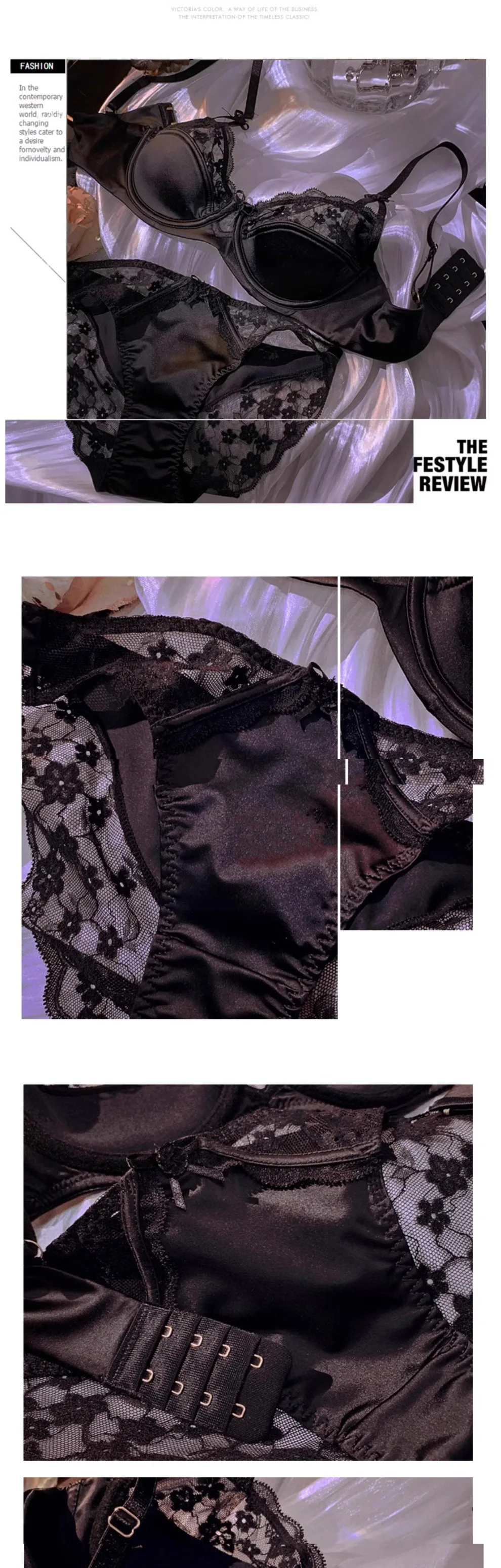 Sexy Lace Floral Bra Set Thin Section Breathable Small Breasts Gathered Collect Side Breasts Glossy Solid Color Underwear Set